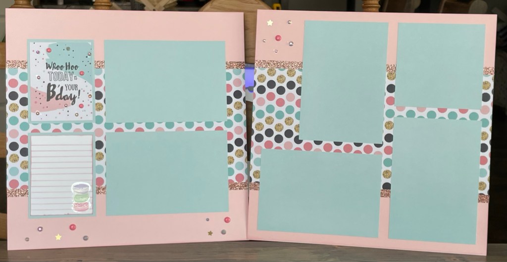 The third layout was a companion layout. I felt the pattern colors didn’t work with the photos of the cake and cookies. So, I continued the same solid colors as well as the rose gold shimmer trim. This became for a grid.