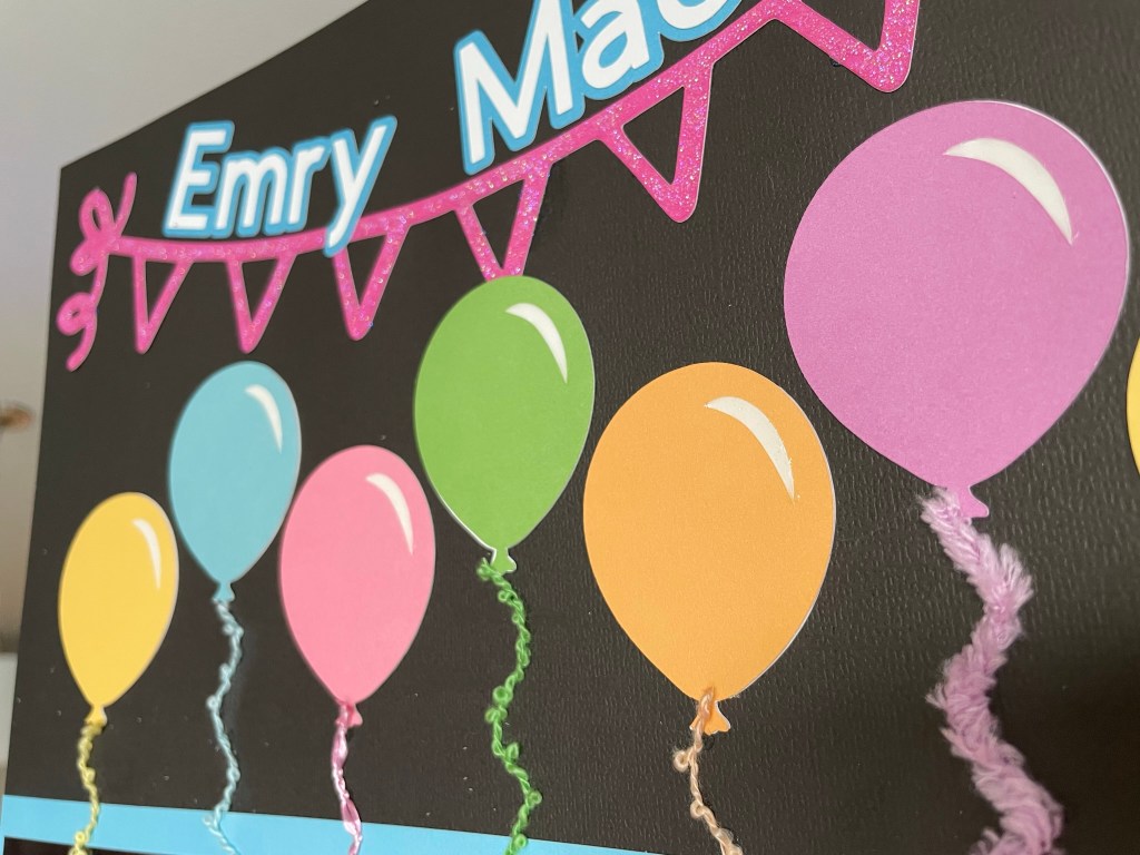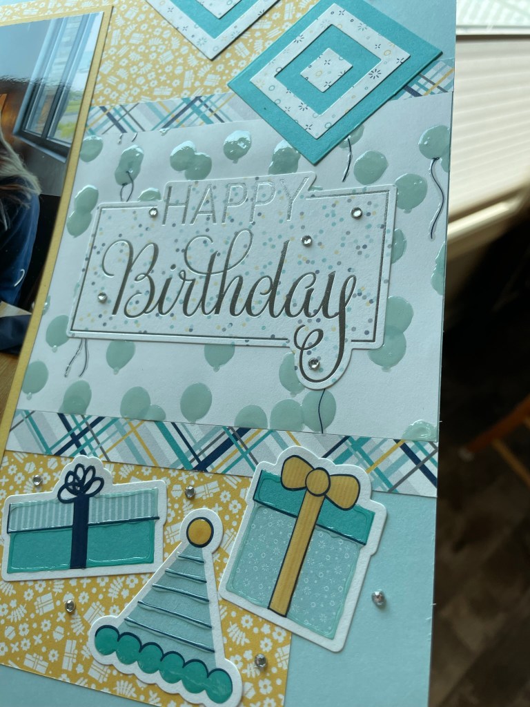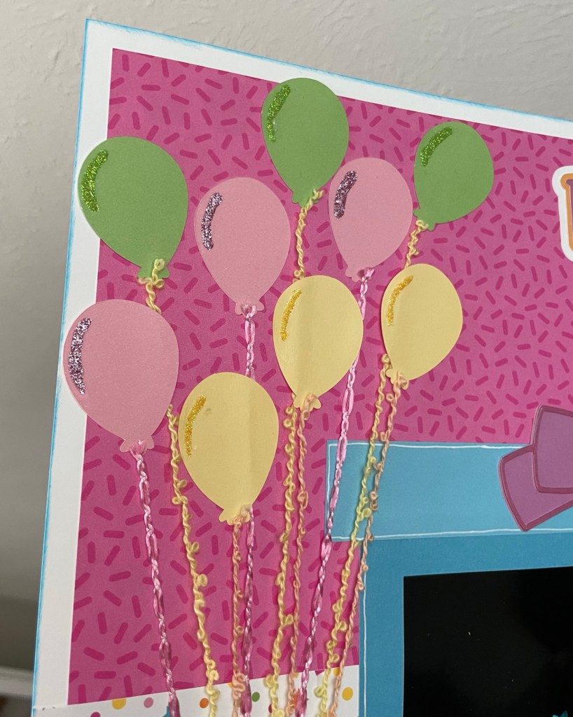I had a 5×7 photo of her with all her presents. It only seemed fitting that it was all in a present. I used a white pin to outline the blue paper. Added liquid glass to the bow and title to so they would shine. The balloons had a touch of colored stickles and fun strings attached. I realized later I should have added a bow to center point where all the strings came together.