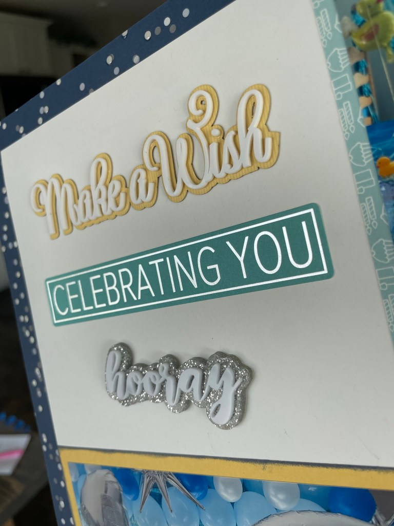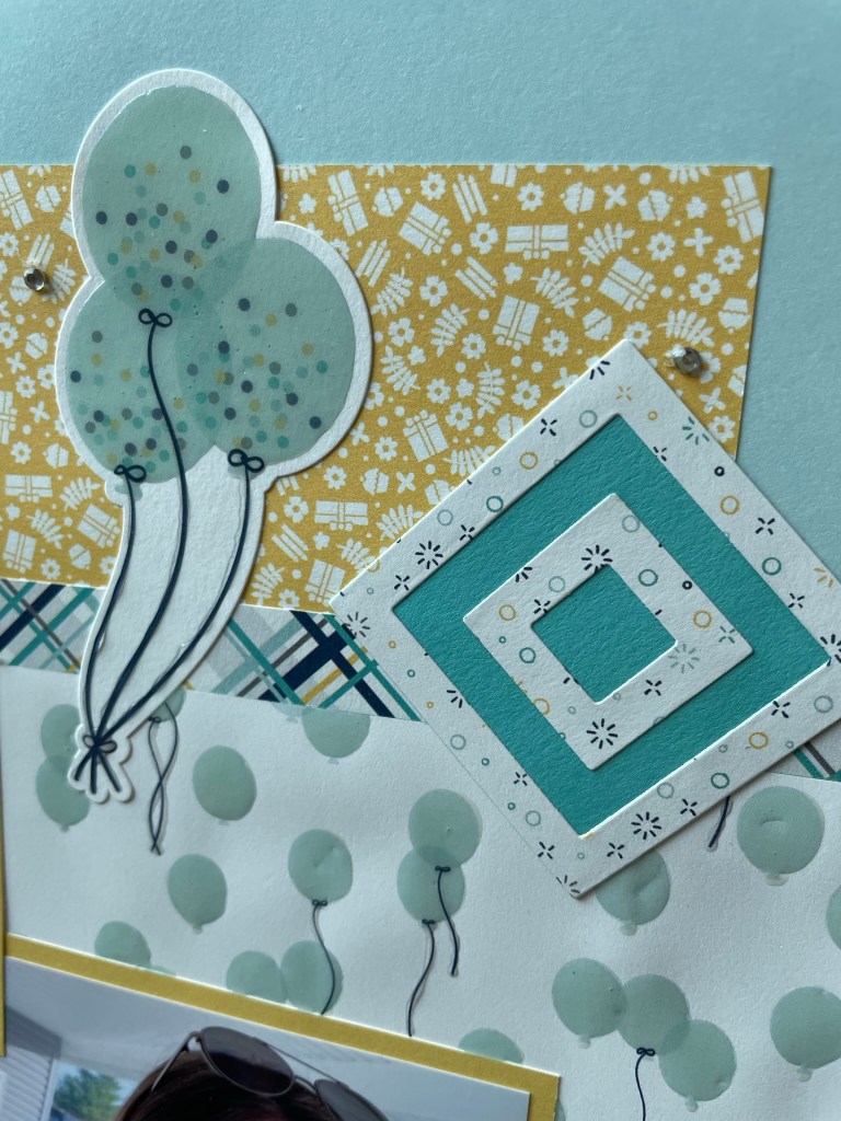I changed the papers and photo mats to better suit my photos. The squares are made using a thin cut then stacked. I used sticker elements for the title and embellishments. I added liquid glass to all the balloons and outlines of the gifts. Then some sparkle gems here and there.