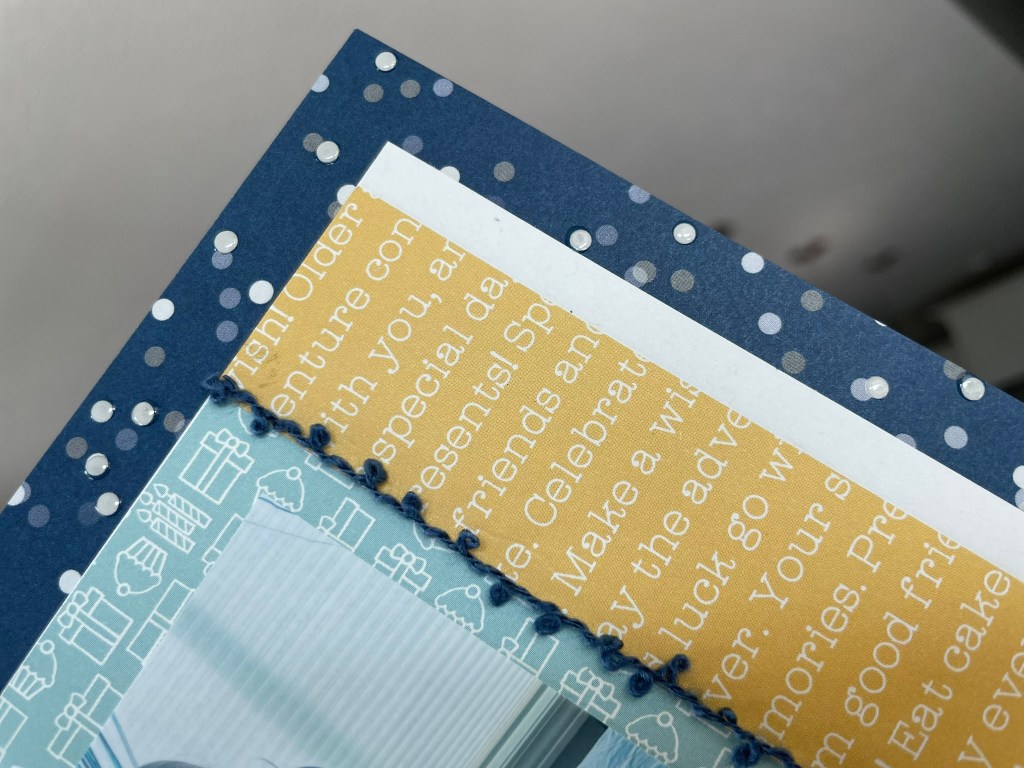 I used the workshop guide for the layout idea and instructions. I did change the papers to better match my photos and the layout a little to give me more room for my pictures. I used outdoor denim ink on the honey cardstock edges. I had some old outdoor denim fibers laying around also that added a nice touch to the paper stripes. This particular paper pack has lots of dimensional elements to it. The make a wish it acrylic on stop of chip board. The celebration you in a sticker with silver foil. I changed out the thirst element for another one I already had that I felt fit better. Its a acrylic. I added liquid glass to the white dots around the outsides on both pages.