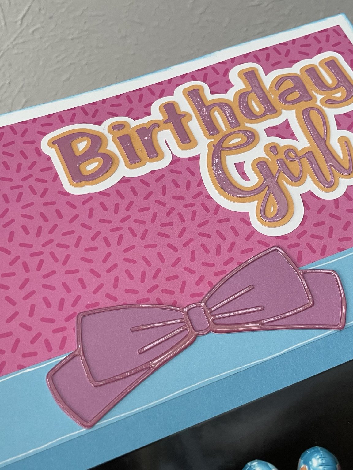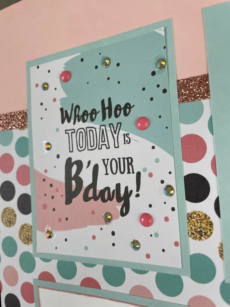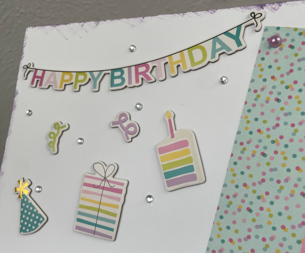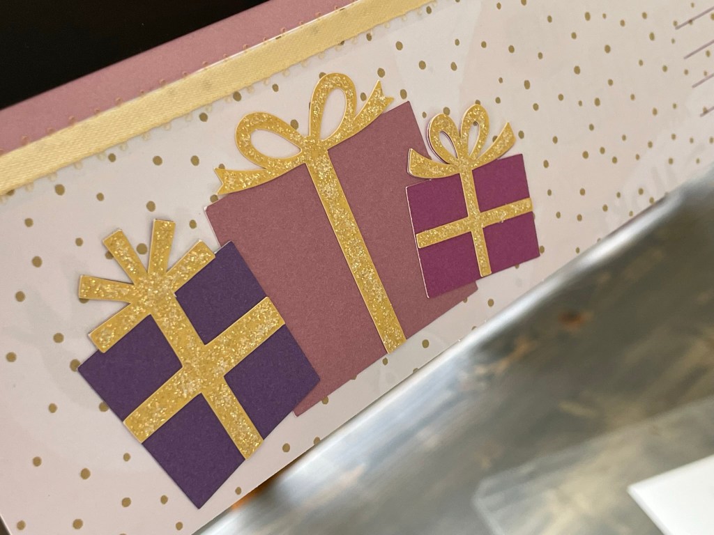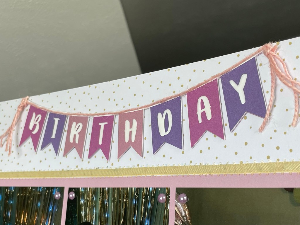 Fun gold dot patterned paper with color splash. Birthday banner and presents were cut using the Cricut. I used the pink twine to hang the banners and created a tassel for each end. Then I added stickles to the ribbons on the presents.