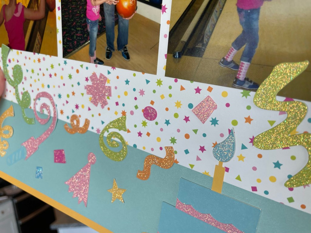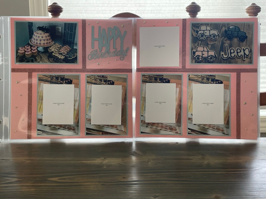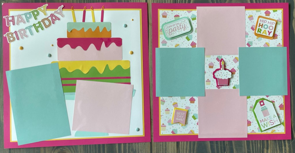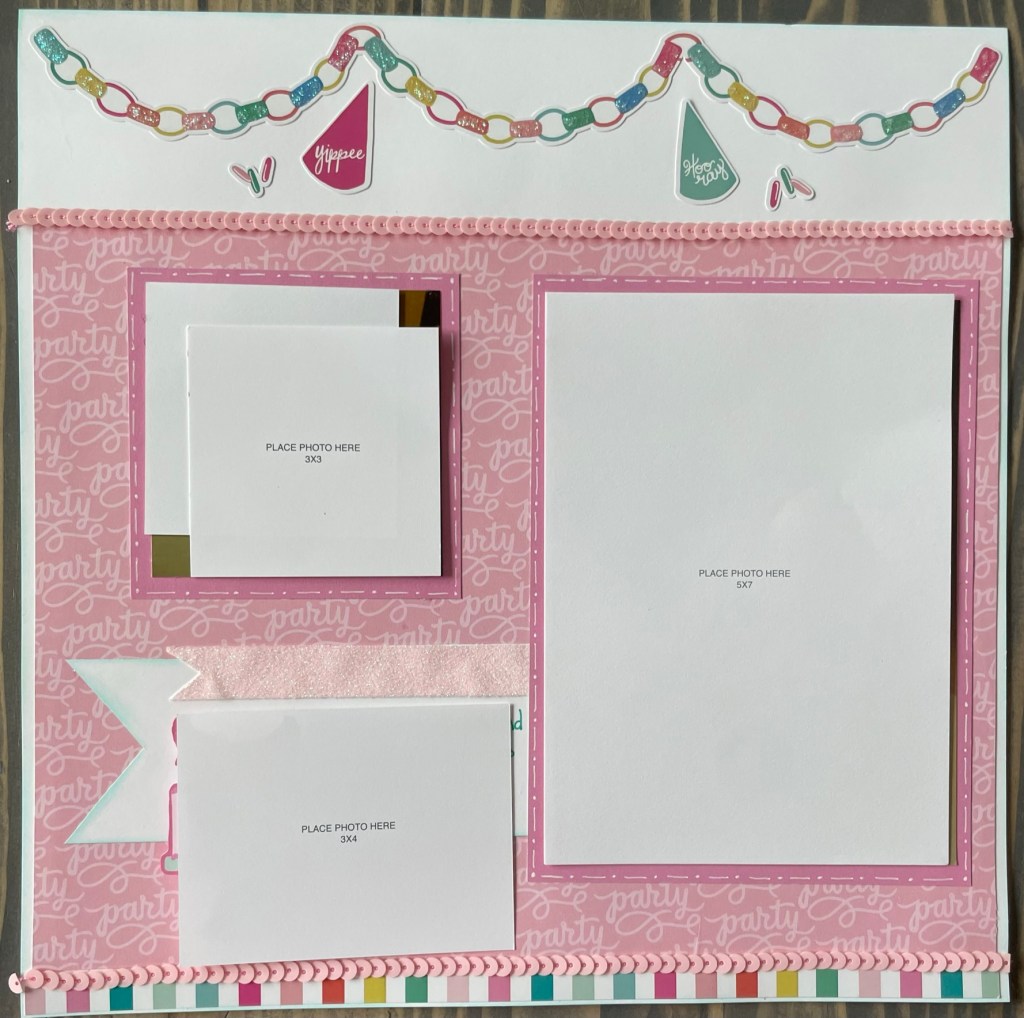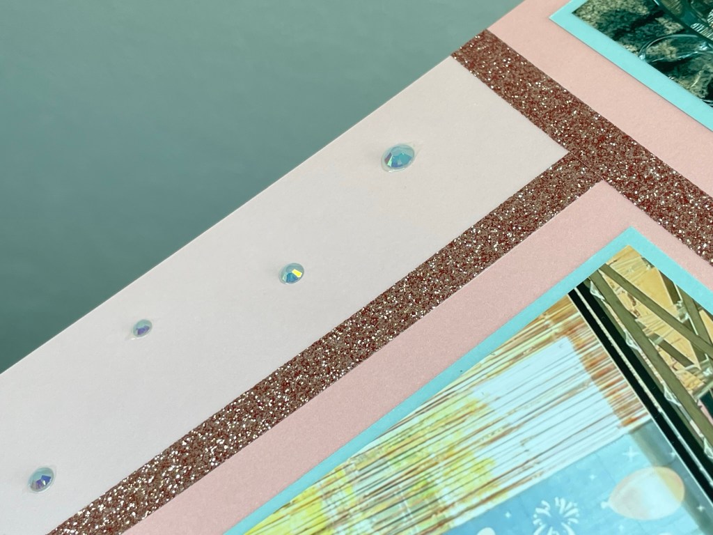 On the first layout, I added a turquoise colored ink to the papaya cardstock and it made the photo mats pop! I had the perfect pink twine to add vertically with the paper strips. Using foam I elevated the juniper paper ribbon, the Happy birthday was a foam sticker pack I had. Then of course the sparkles to enhance!