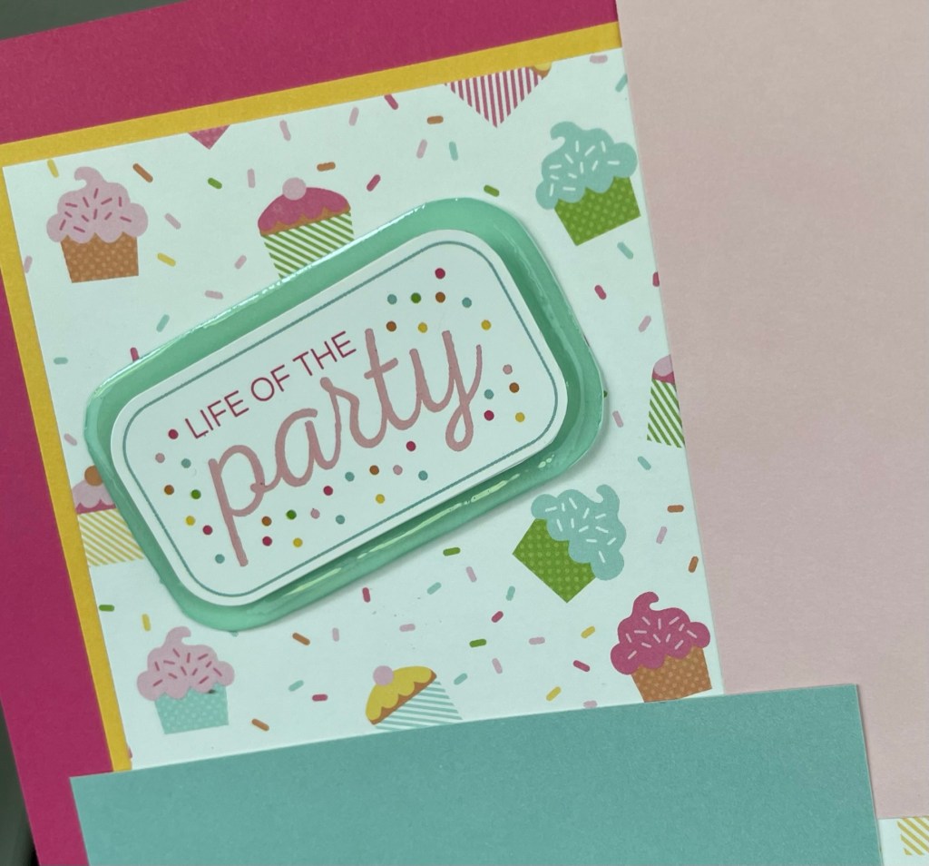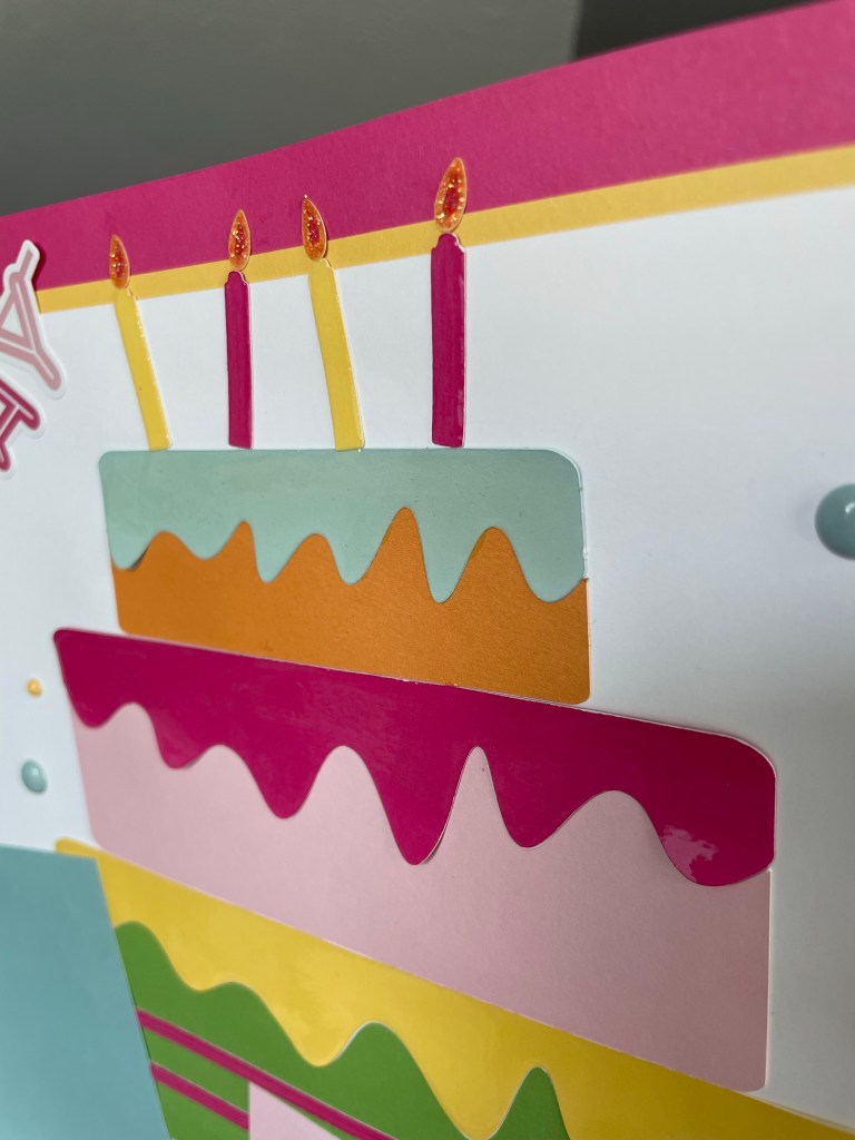I used bolder colors with the cupcake pattern for this layout. I used a mix of elements. Enamel bots to accent. The tags on the right side are stickers that I put on white cardstock. Then popped them up with foam and colored backgrounds to stand out. My favorite was the cake! Its an image on Cricut with several layers. For the frosting on each of the layers I added liquid glass then on the candles I add orange stickles.