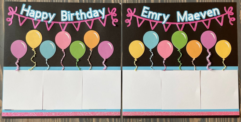 First I have to say this was out of my comfort zone. I had all the pieces cut and laid out on white cardstock. Everything blended together, so I tired black cardstock. And WOW is all I could think. I had inspiration for this layout from a layout I seen with all balloons across the top. While I liked the concept, I wanted more. I made the balloons smaller and added a banner. I had different types of fibers to use as the balloon strings. The banner and strip at the bottom looked the like the same thing right? NOPE! The bottom is shimmer trim and the banner is cardstock and fairy dust!