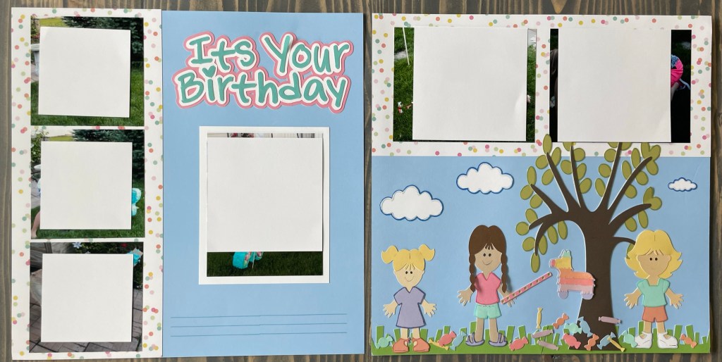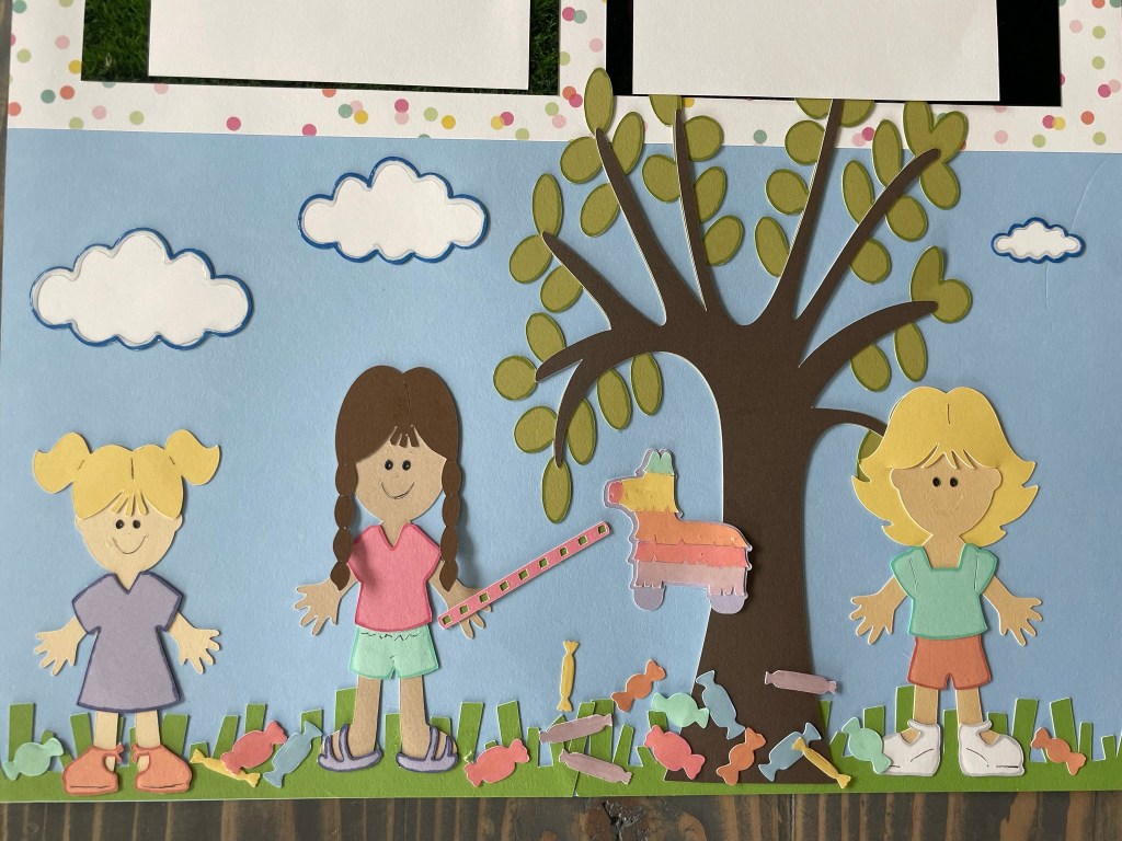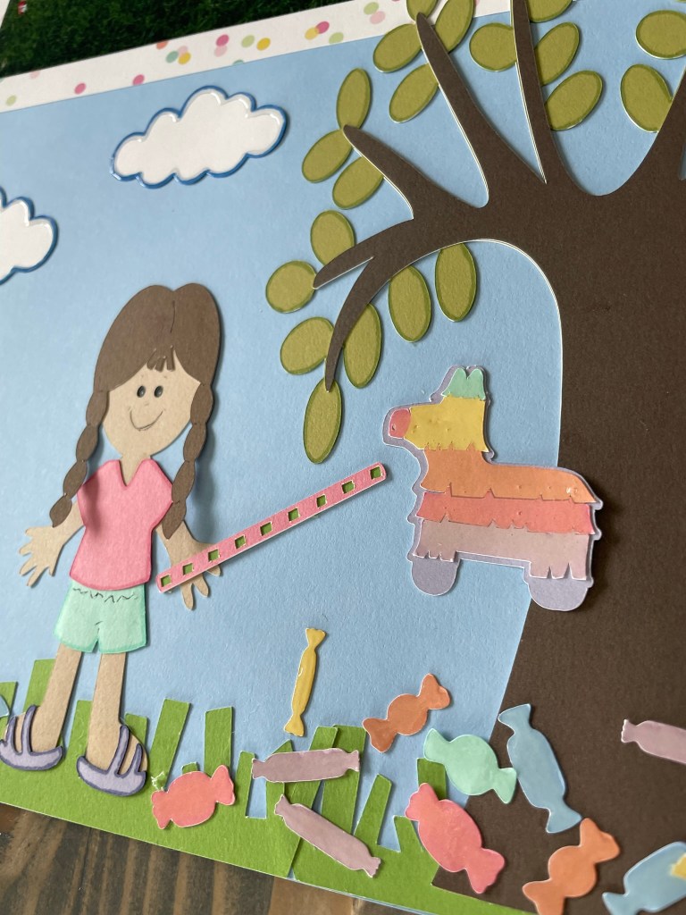 Sometimes a layout just needs more. I made a scene to represent the bigger picture. I used makers to outline the pieces in a darker shade. I used liquid glass on something, the whole piñata and candy and only the outline of the clouds. After I was done I realized I should have added a few marks on the candy wrappers.