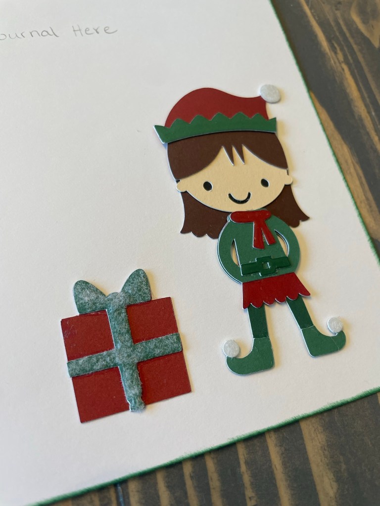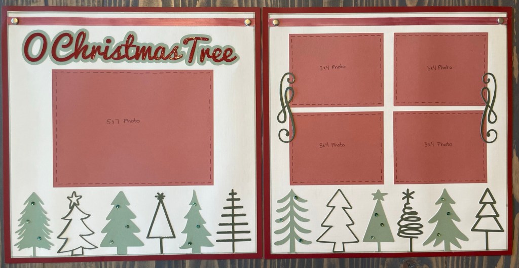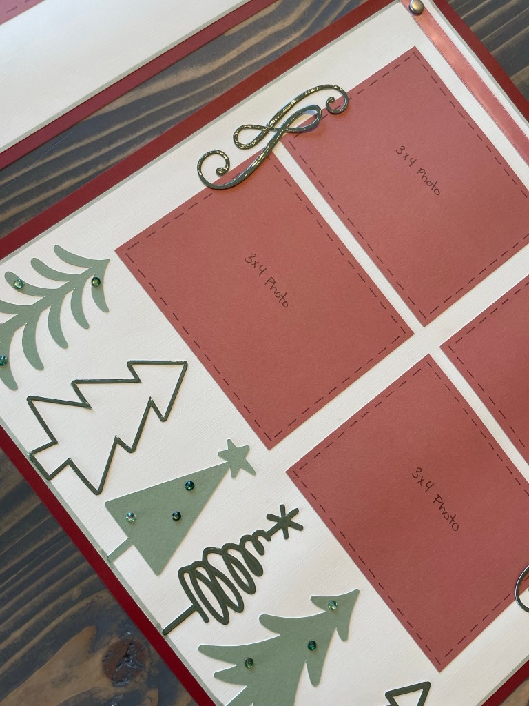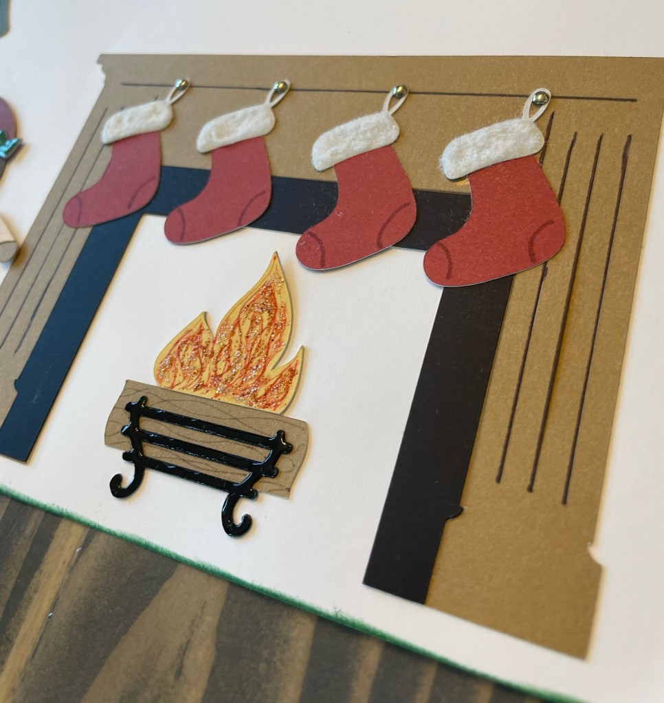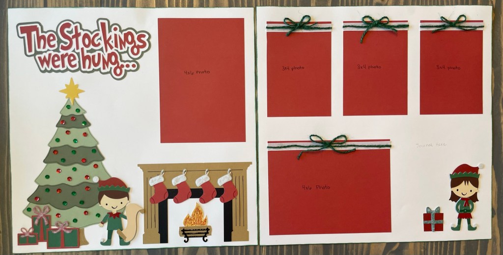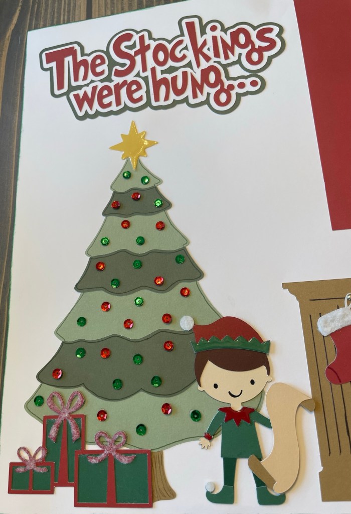 So many elements going on in this layout. Each of the pieces are layers. I used ribbon and twine to my presents on the photo mats. Stickles glitter for the fire; flock for stockings, and sequence for the tree.