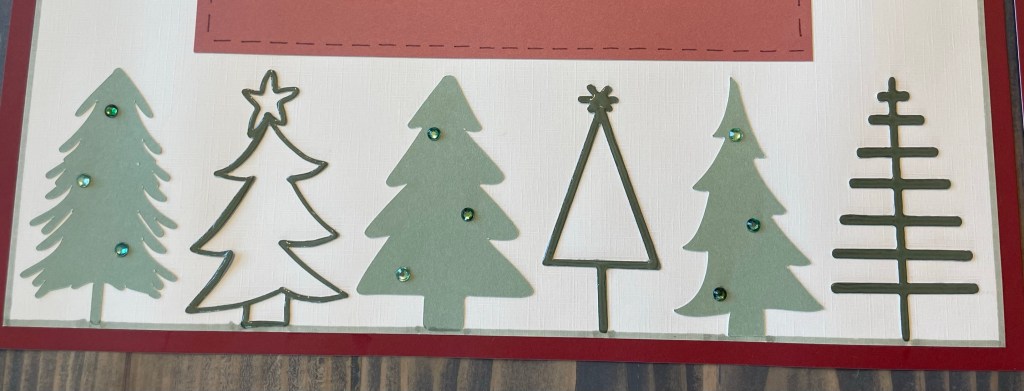 Two greens and two reds. The cream cardstock is textured like linen. The ribbon was inked to match the cardstock color. I used alcohol markers to color the rhinestones.