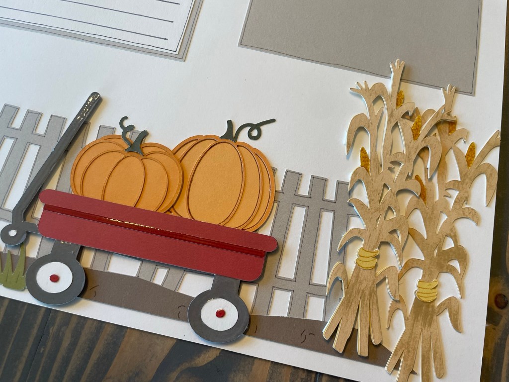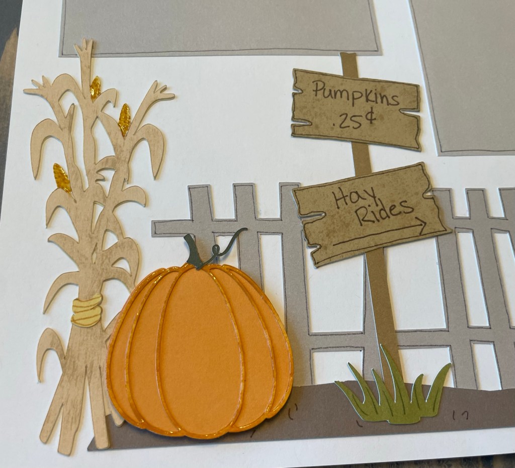 Fall Pumpkin Patch So many paper piecing in this layout. This is by far my favorite fall layout I have created. The colors flow nicely. The sign tied it all in for me. I felt like I was at the pumpkin patch Multiple layers with shading and inking Cute hand drawn kernels on the corn cobs
